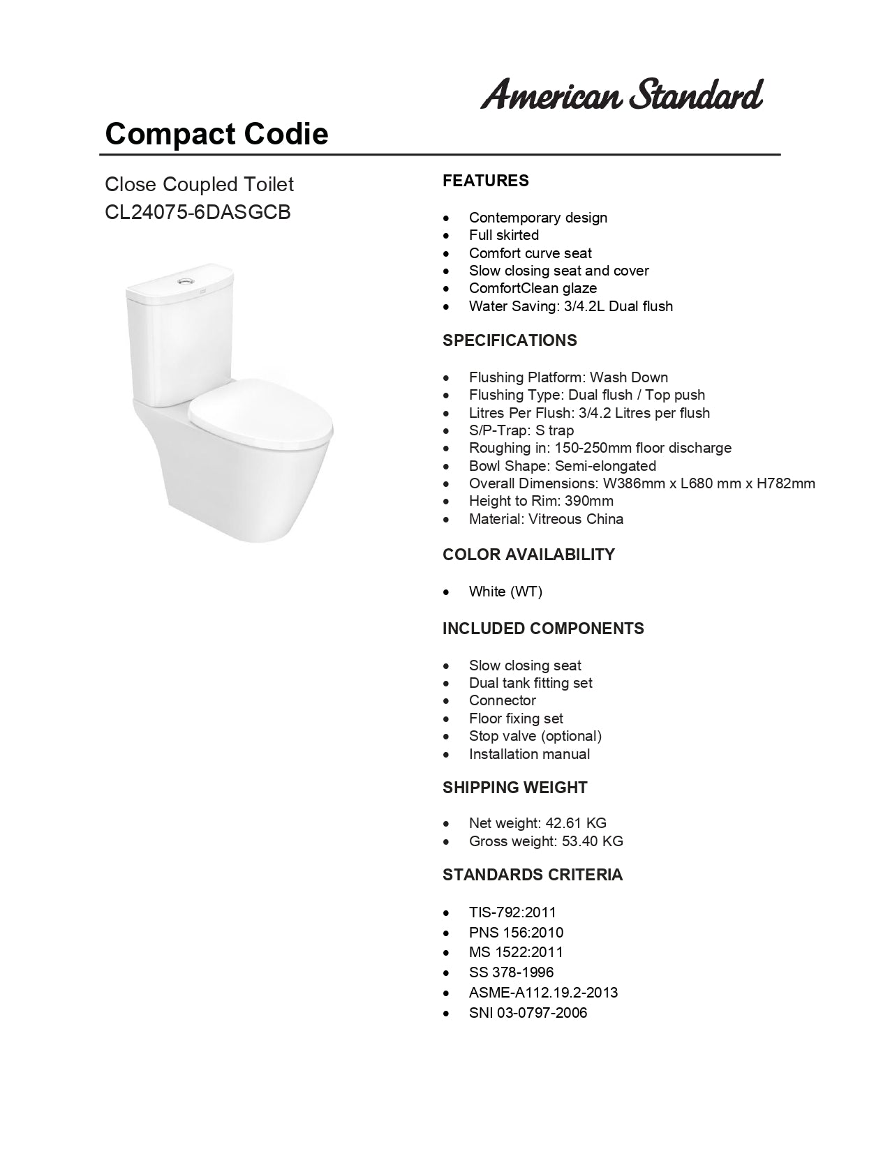 American Standard Compact Codie Close Coupled Water Closet CL24075-6DASGCB