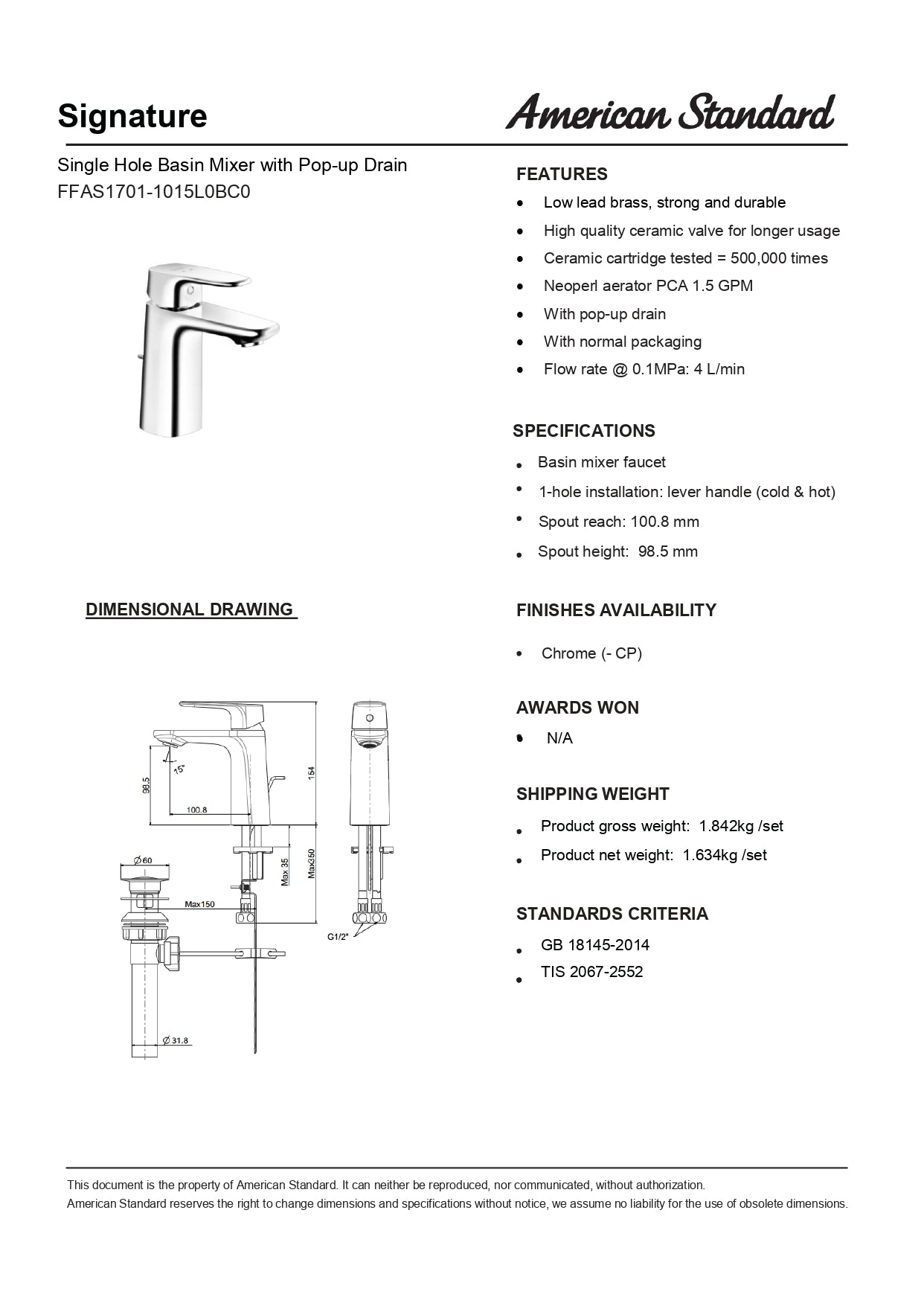 American Standard Signature Basin Mixer With Pop-up Drain FFAS1701-1015L0BC0